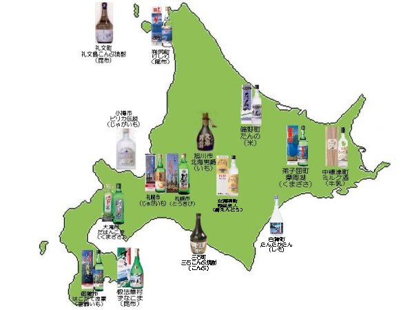 礼文町 こんぶ焼酎 利尻町 りしり(昆布) 小樽市 ピリカ伝説(じゃがいも) 端野町 たんの(米) 旭川市 北海男爵(いも) 弟子屈町 摩周湖(くまざさ) 中標津町 ミルク酒(牛乳) 白糠町 たんたかたん(しそ) 女満別町 野良美人(えんどう) 三石町 三石こんぶ焼酎(こんぶ) 札幌市 じゃがいも 札幌市 とうきび 大滝村 だはんこき(くまざさ) 函館市 はこだて夜景(男爵いも) 椴法華村 すなこま(こんぶ)